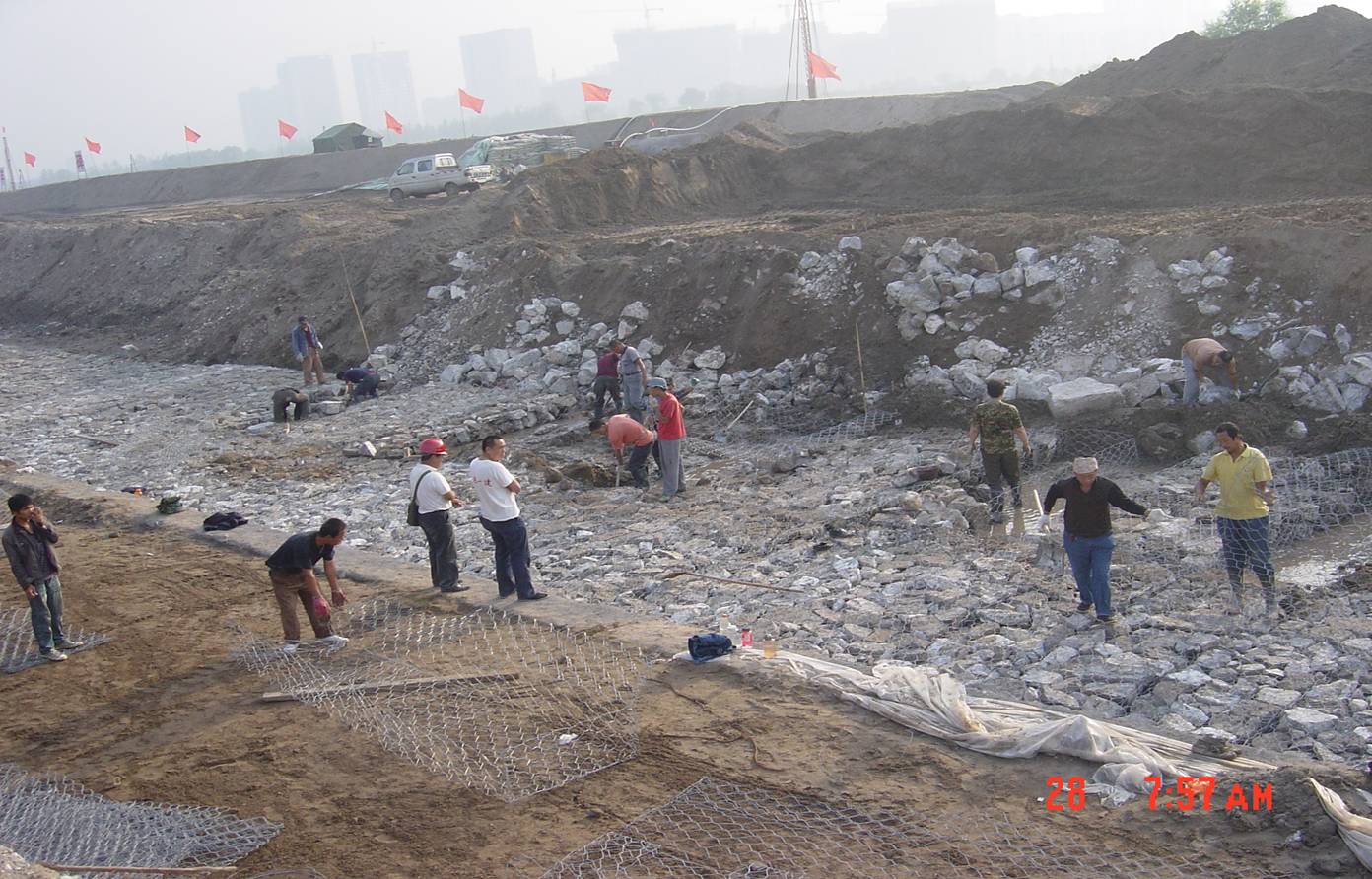 最后把石籠網箱置于基坑槽內,用挖掘機配合人工填入石料。