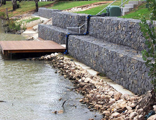 4、鋅-5%、鋁-混合稀土合金鋼絲包塑:在鋅-5%鋁-混合稀土合金鋼絲的表面包一層PVC或PE保護層,然后編織成各種規格的格賓石籠網。這層保護層將大大增加對高污染環境的保護,并通過無色選擇與周圍環境相結合。